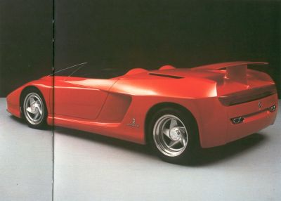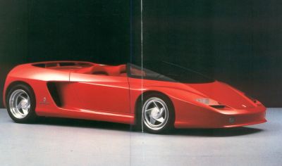 The Mythos was built in 1988 and designed by Pininfarina, under supervision of Lorenzo Ramaciotti. The Mythos is not, and was not intended to be, a piece of sculpture pure and simple. This prototype is a speedster with a mid-rear engine, which tackles the relationship between volumes from a provocative, in some ways extreme, point of view. The cockpit and the fine frontal area from which, without any change of angle, sprung the curved windscreen was considered its calling card. The Mythos is 18 cm shorter and 13,5 cm wider than the Testarossa and the body was made of carbon fiber. The grooves in the side extending as far as the radiators and the aerodynamic devices blended in harmoniously with the overall line of the car. By means of an electronic control unit, at speeds over 100 km/h the back wing would be raised (300 mm, 12 degrees towards the front). The effect of this was to exert a extra downforce on the rear wheels. At the same time at the front, a spoiler (30 mm) would appear to increase the load on the front end. When the speed droped below 70 km/h the wing and spoiler would go back to their normal positions. The single-armed windscreen wiper is hidden into a space in front of the windscreen and purring into action when needed. The seats and headrests are a part of the rear bulkhead. A whole host of switches are dotted around the dashboard. The Mythos also has a special outlet and the body is made of synthetic material.